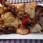meatball, kebapche – grilled minced meat with spices, a pork neck steak, meat on a skewer, chips, salad