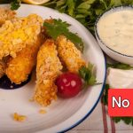 Crispy chicken fillets with cornflakes, garlic sauce